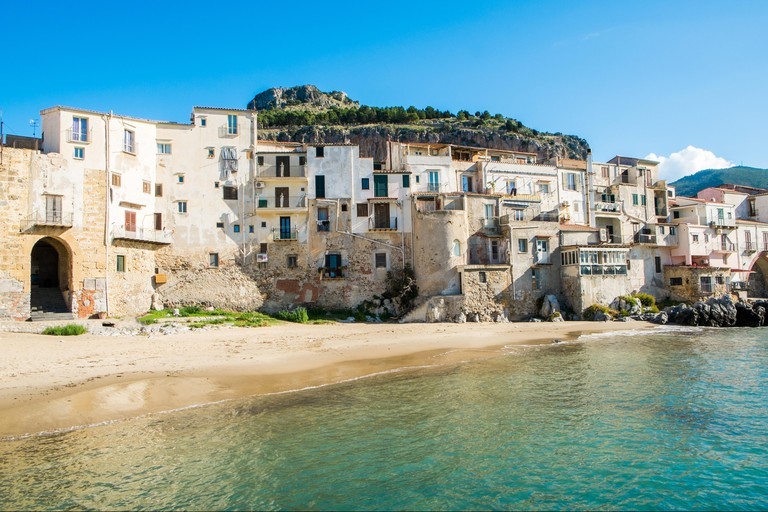 From left: Cefalù beach By Edoardo Oliva / Canva and Cefalu old town, Sicily, Italy | © Elisa Locci / Alamy Stock Photo