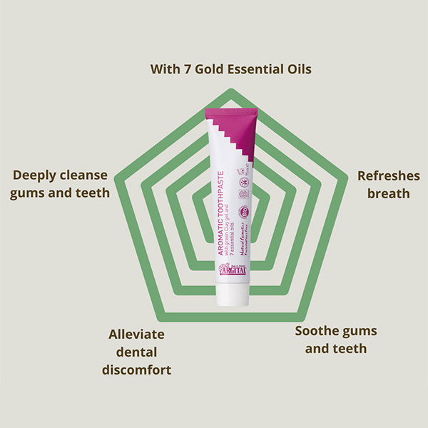 Argital toothpaste’s natural ingredients cleanse teeth by gently absorbing impurities, reducing the need for vigorous brushing.
