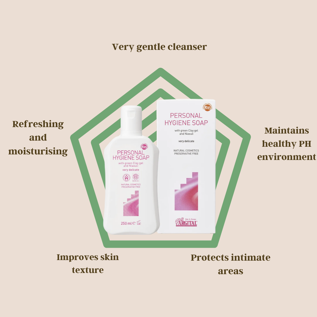 Argital Delicate Intimate Hygiene Soap is designed to soothe and protect the intimate area. Organic niaouli essential oil helps prevent fungal infections, itching, rashes, and odour, while Sicily green clay gently cleanses and soothes inflammation. The formula maintains the skin’s natural pH balance, ensuring freshness without irritation. Organic essential oils of cloves, lavender, and peppermint leave a refreshing feeling after use.